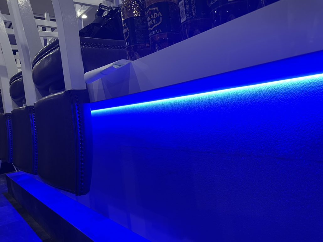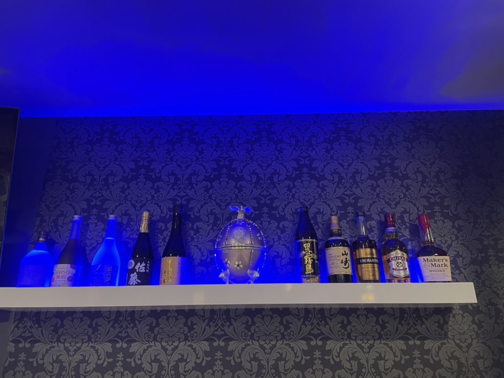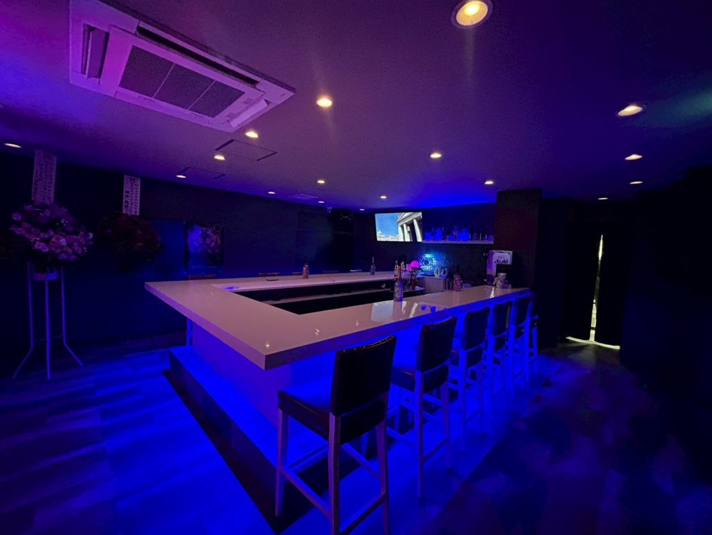 カウンター下と棚下のブルーのライトがアクセントでよりお洒落になりました。